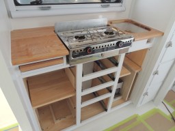 Kitchen lower cabinet installation sequence-heat shield for stove, stove, slide out cutting board, drawers, doors, sink