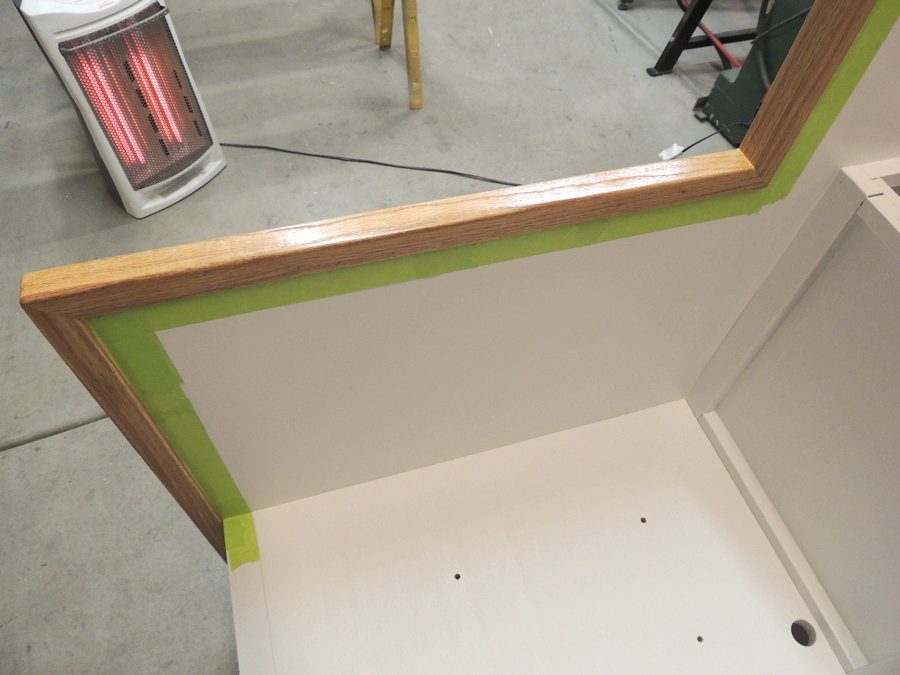 Masked and urethaned red oak edge trim on shower area divider